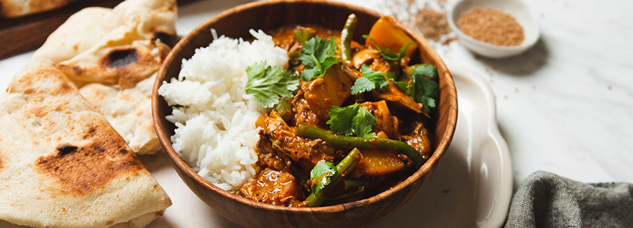 Banana blossom is popular in south-east Asian and Indian cooking. We have used it in this warming korma curry recipe to create a meaty base. Best served with rice and your choice of accompaniments – raita, tomato chutney, roti and papadums.