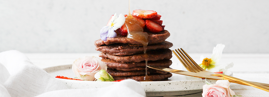 Start the day right with this delicious cacao pancake recipe with coconut caramel sauce!