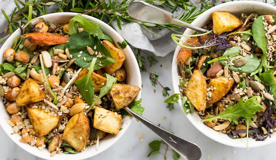 - Add the greens and coriander to the roasted veggies, season to taste, and toss with the dressing. Transfer to a large bowl or platter and scatter with roasted chickpeas. Serve with hummus.