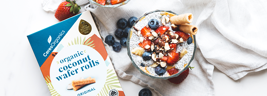 This peanut butter chia parfait is an easy and healthy breakfast or dessert option. Topped off with chopped hazelnuts, cacao nibs and Ceres Organics Coconut Wafer Rolls it’s a delicious treat the whole family will love!