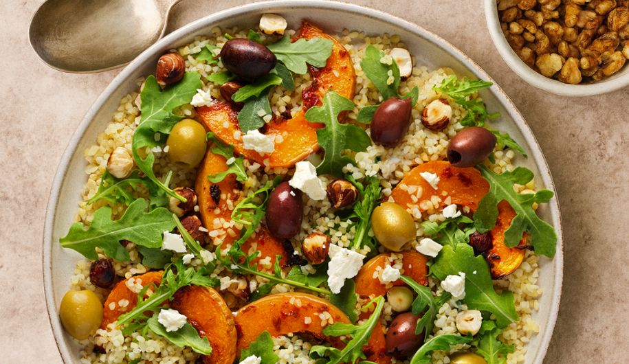 A wholesome bowl full of nourishing ingredients. Sweet roasted pumpkin meets hearty bulghur wheat, toasted nuts, and creamy feta for a delicious mix of colour, texture, and flavour.