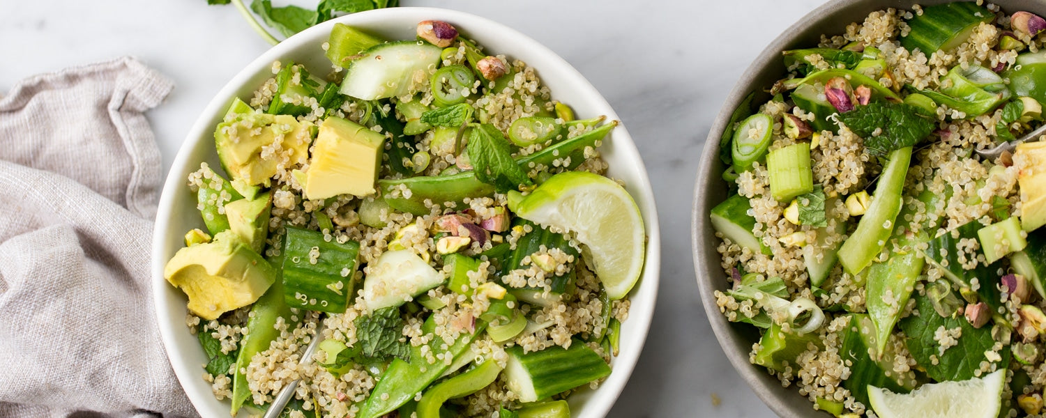 - In a salad bowl, combine the cooked quinoa with the remaining salad ingredients.