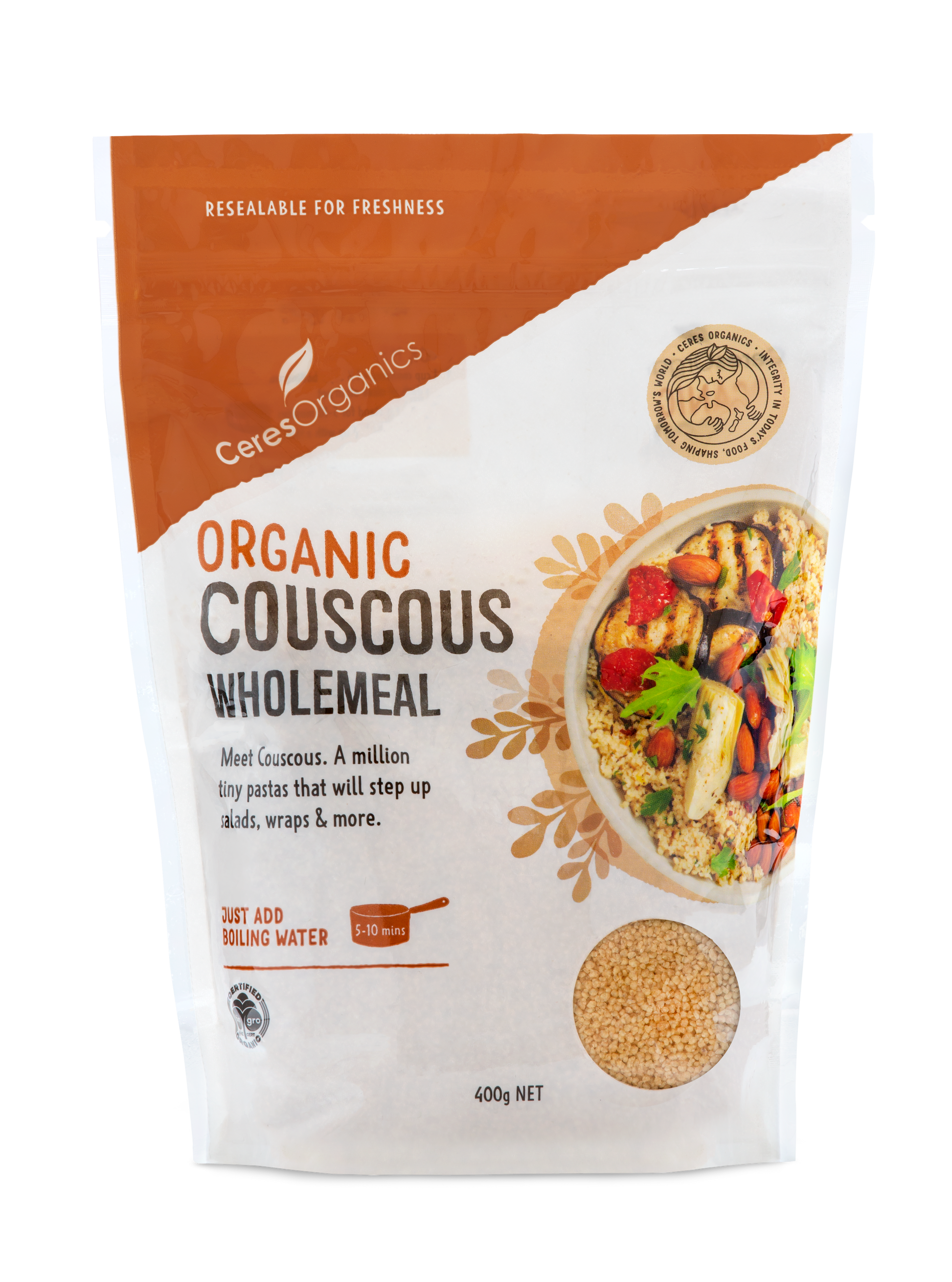 At Ceres Organics we like our food wholesome and pure. So our organic Wholemeal Couscous is just that! Straight up goodness. Enjoy the natural deliciousness of couscous the way it should be. This nourishing wholefood provides protein and dietary fibre, and it's super versatile. Use in everything from breakfast dishes, salads, hearty mains and even desserts.